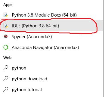 Now in search option, type Python, then you will get IDLE(Python3.8 64-bit) and you click on it, then you will get the python environment where you will write the code.